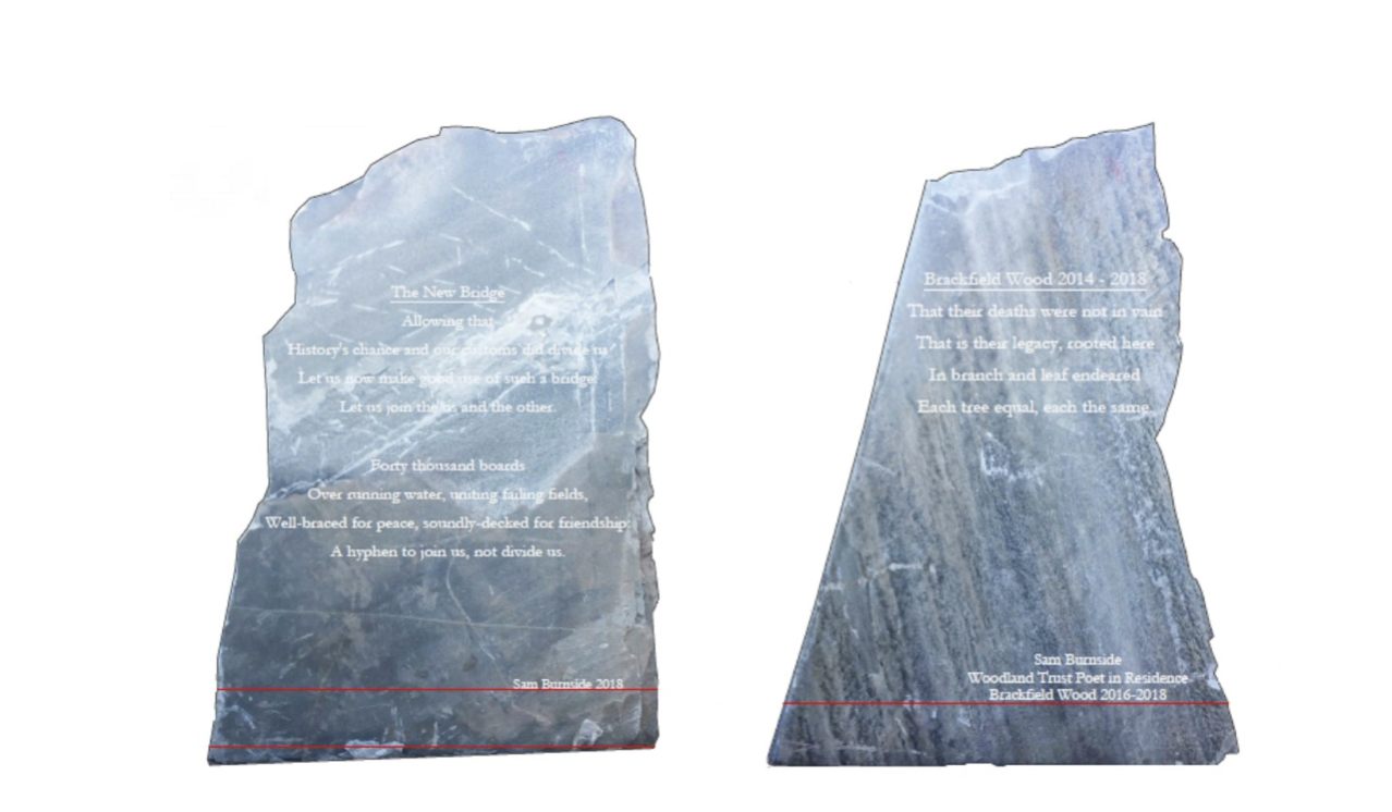 “Eight poems engraved on stone pillars in Brackfield Memorial Woods in Derry/Londonderry and incorporated into a poetry trail. (Sam Burnside was Writer in Residence with Woodland Trust when he wrote Brackfield Bawn, 2017 from which these poems are taken.” Woodland Trust UK