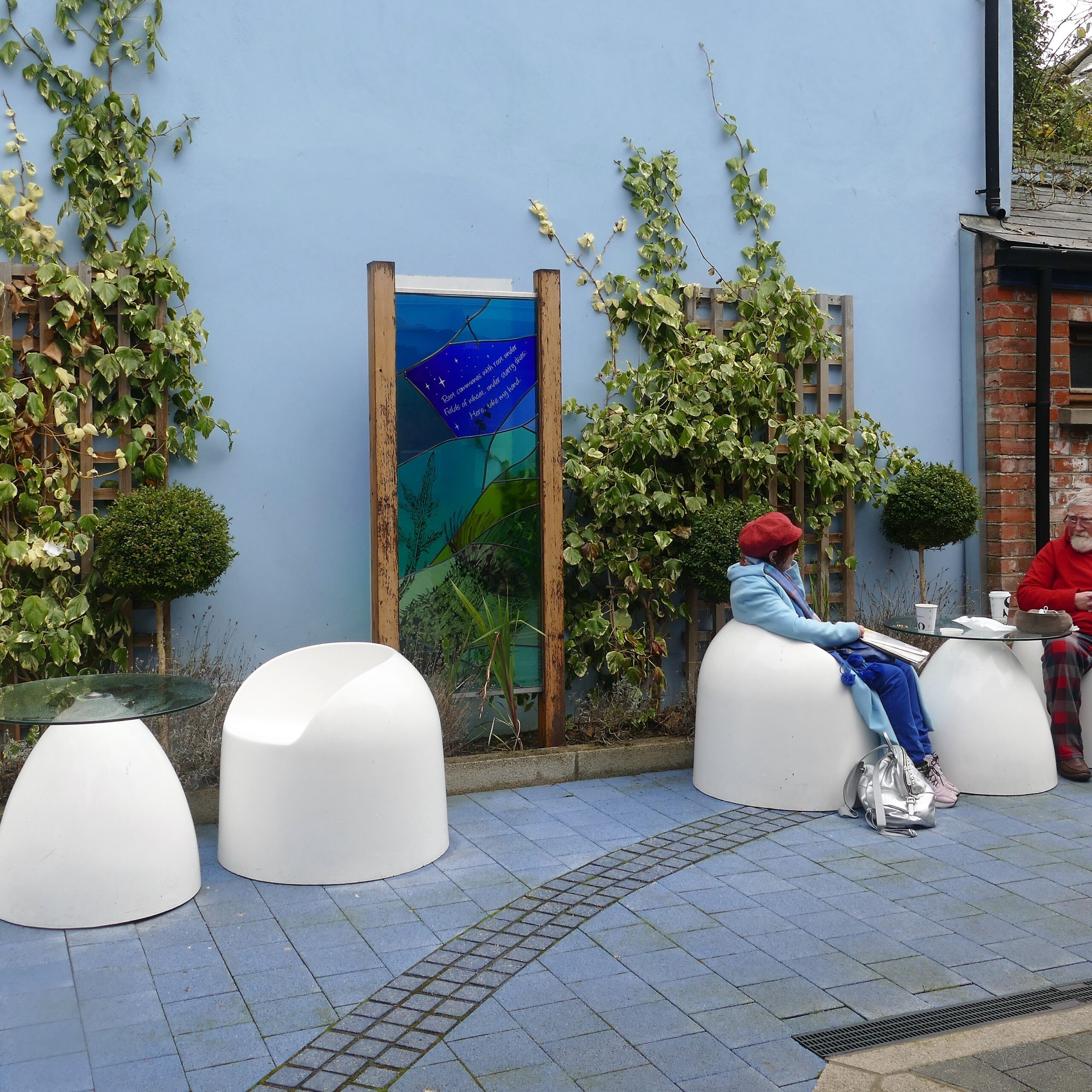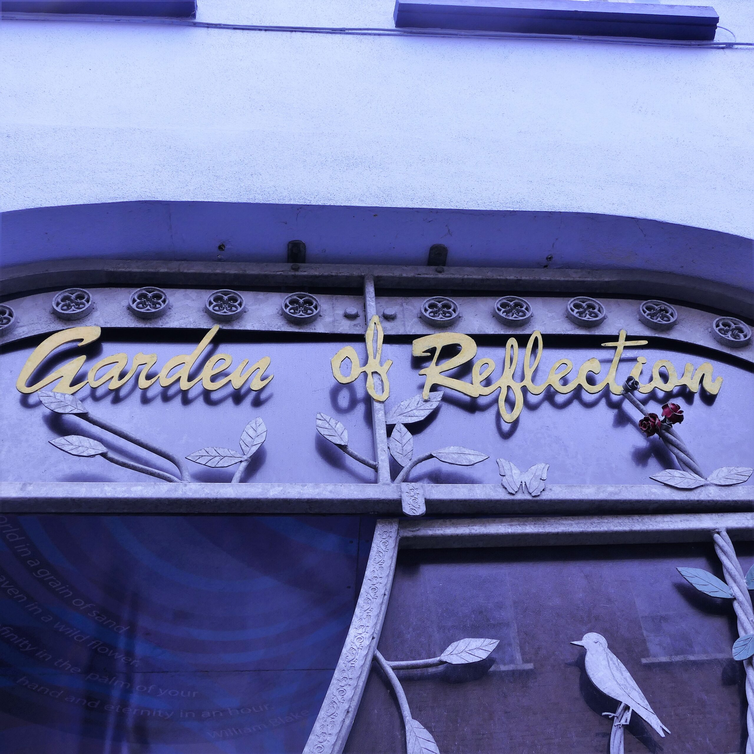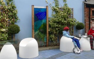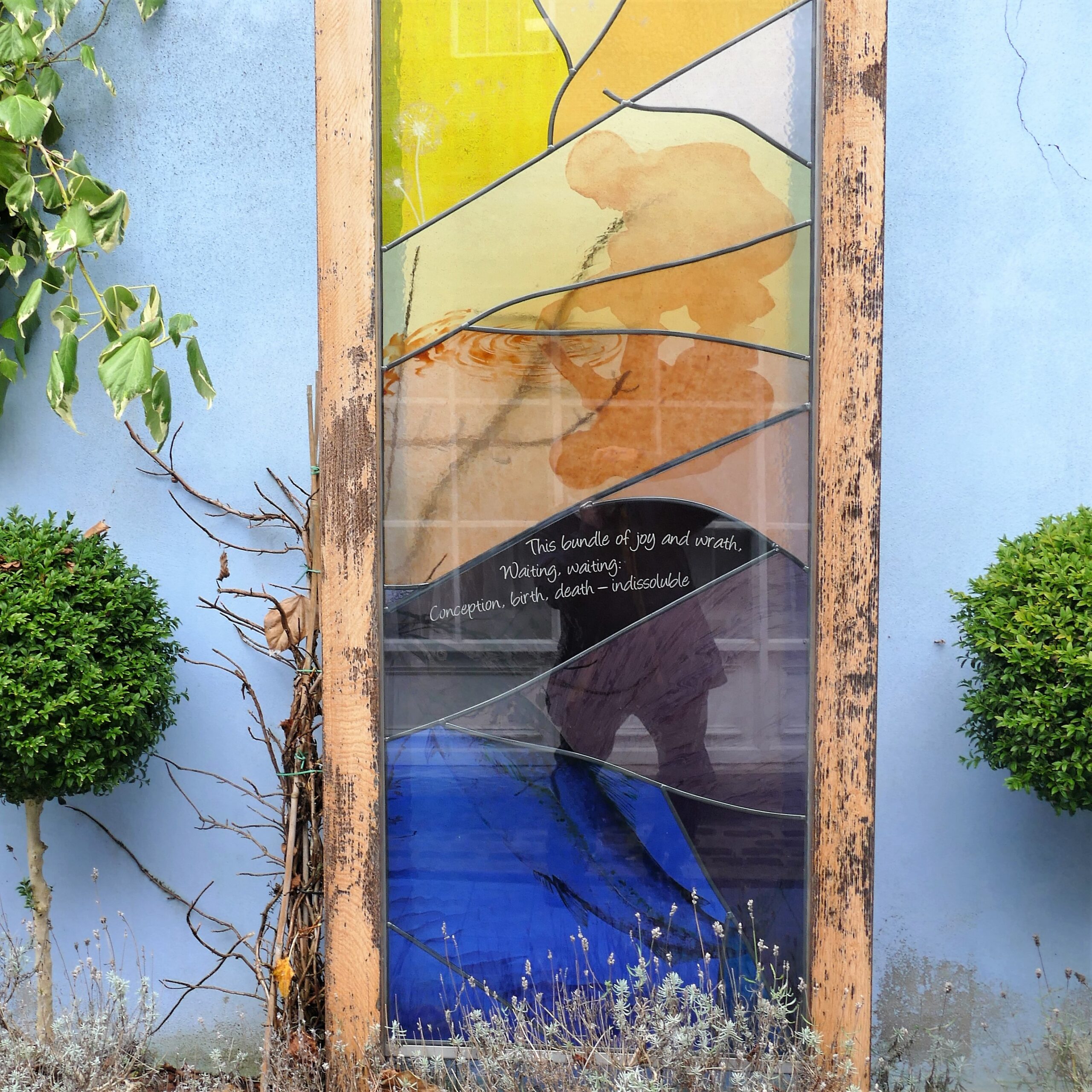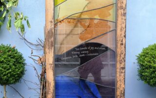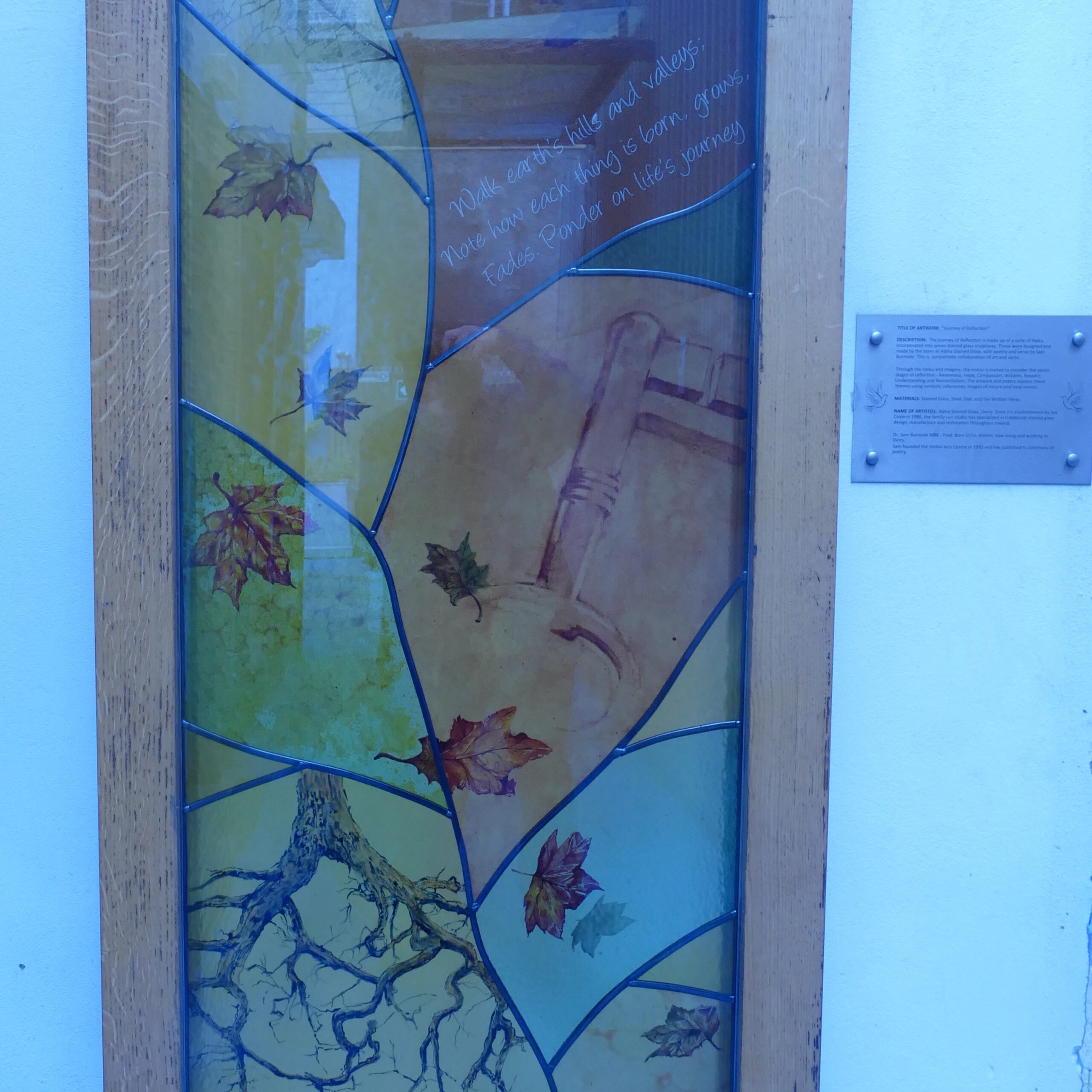 The public art work within the garden was selected through an open competition. Together with Alpha Stained Glass, who designed and constructed seven free-standing stained glass panels, Burnside wrote seven Haiku on the theme of The Journey. Each poem asks the onlooker to reflect in turn on Awareness, Hope, Compassion, Wisdom, Respect, Reconciliation and Understanding.