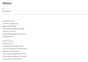 'Silence' By Sam Burnside When my dry dust, Scattered at evening time, Blindly, in fisted hand And arm