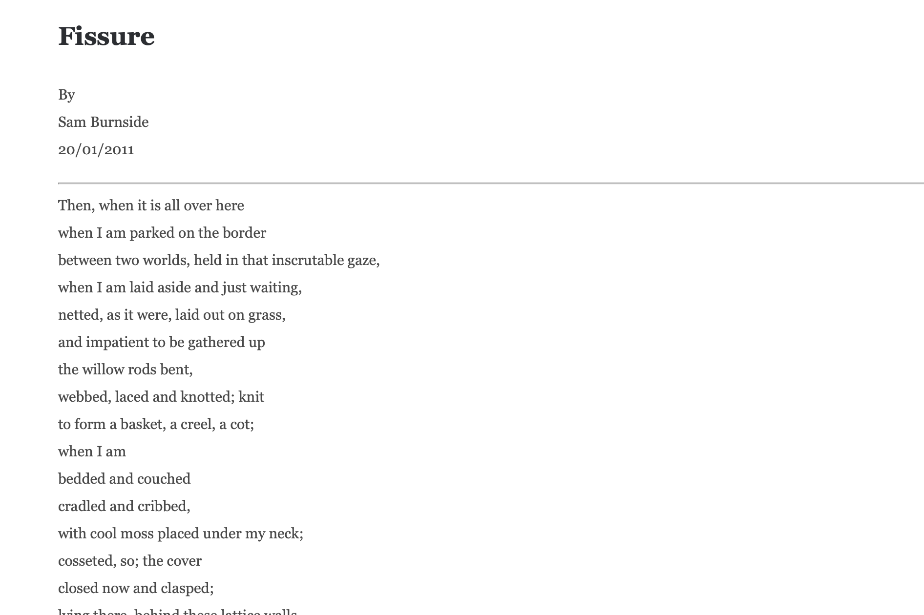 LauraAdmin2021-06-14T21:46:48+00:00'Fissure' By Sam Burnside 20/01/2011 Then, when it is all over here when I am parked on the border between two worlds, held in that inscrutable gaze, when I am laid aside and just waiting, netted, as it were, laid out on grass, and impatient to be gathered up the willow rods bent, webbed, laced and