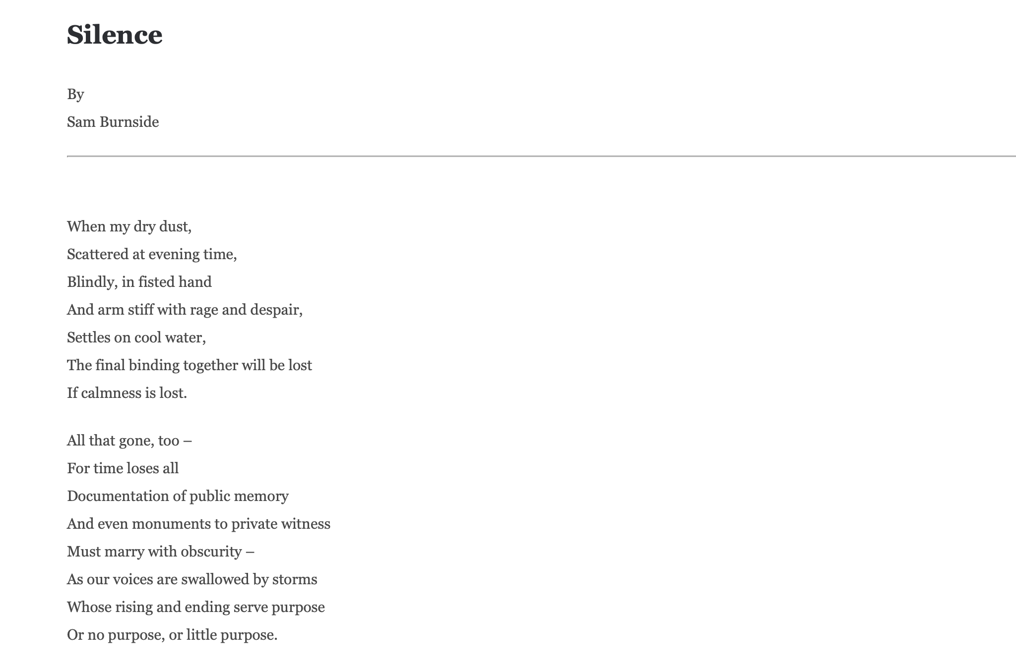 LauraAdmin2021-06-14T21:48:26+00:00'Silence' By Sam Burnside When my dry dust, Scattered at evening time, Blindly, in fisted hand And arm stiff with rage and despair, Settles on cool water, The final binding together will be lost If calmness is lost. All that gone, too – For time loses all Documentation of public memory And even monuments to private