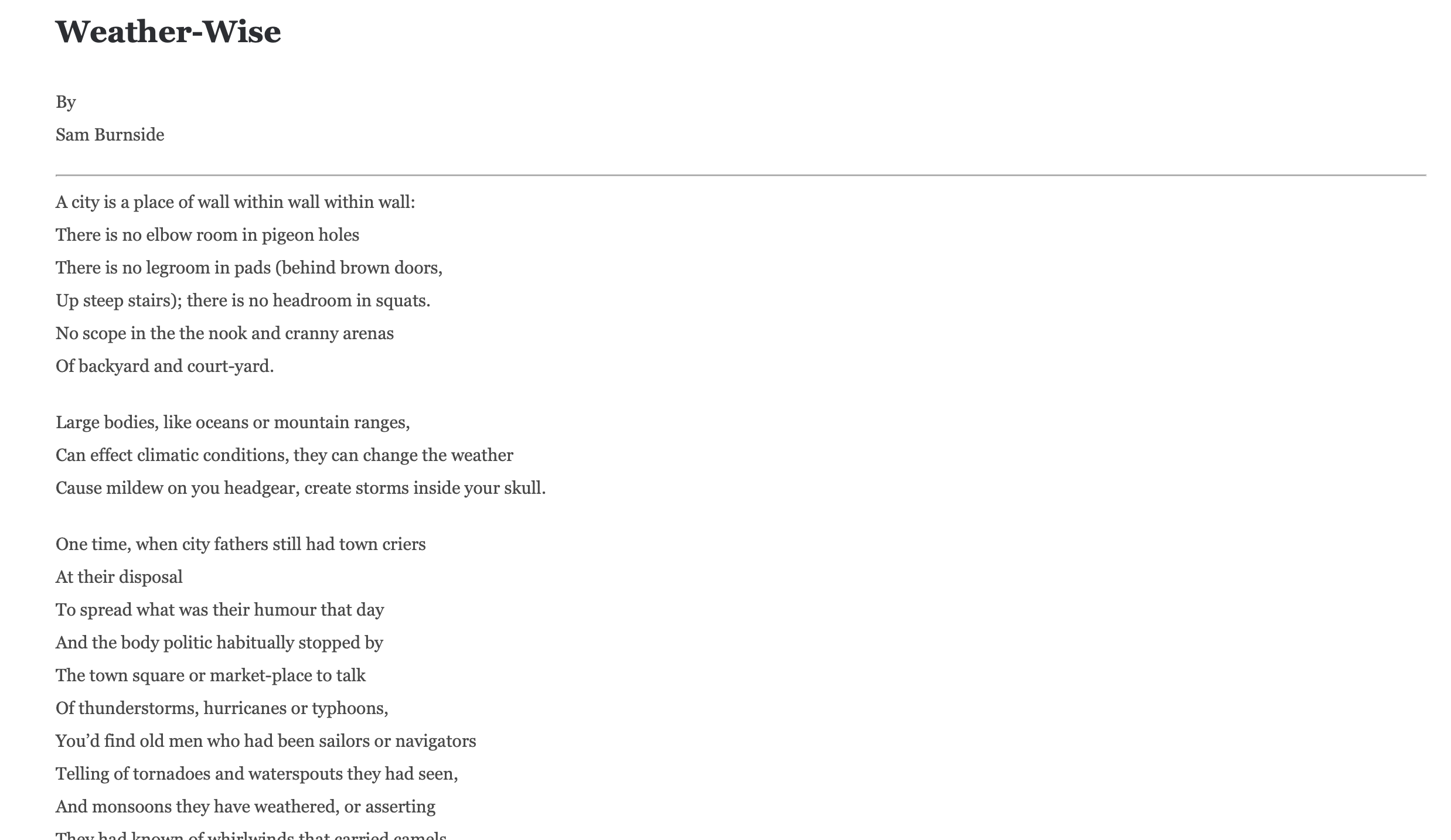 LauraAdmin2021-06-14T21:50:10+00:00'Weather-Wise' By Sam Burnside A city is a place of wall within wall within wall: There is no elbow room in pigeon holes There is no legroom in pads (behind brown doors, Up steep stairs); there is no headroom in squats. No scope in the the nook and cranny arenas Of backyard and court-yard. Large bodies,