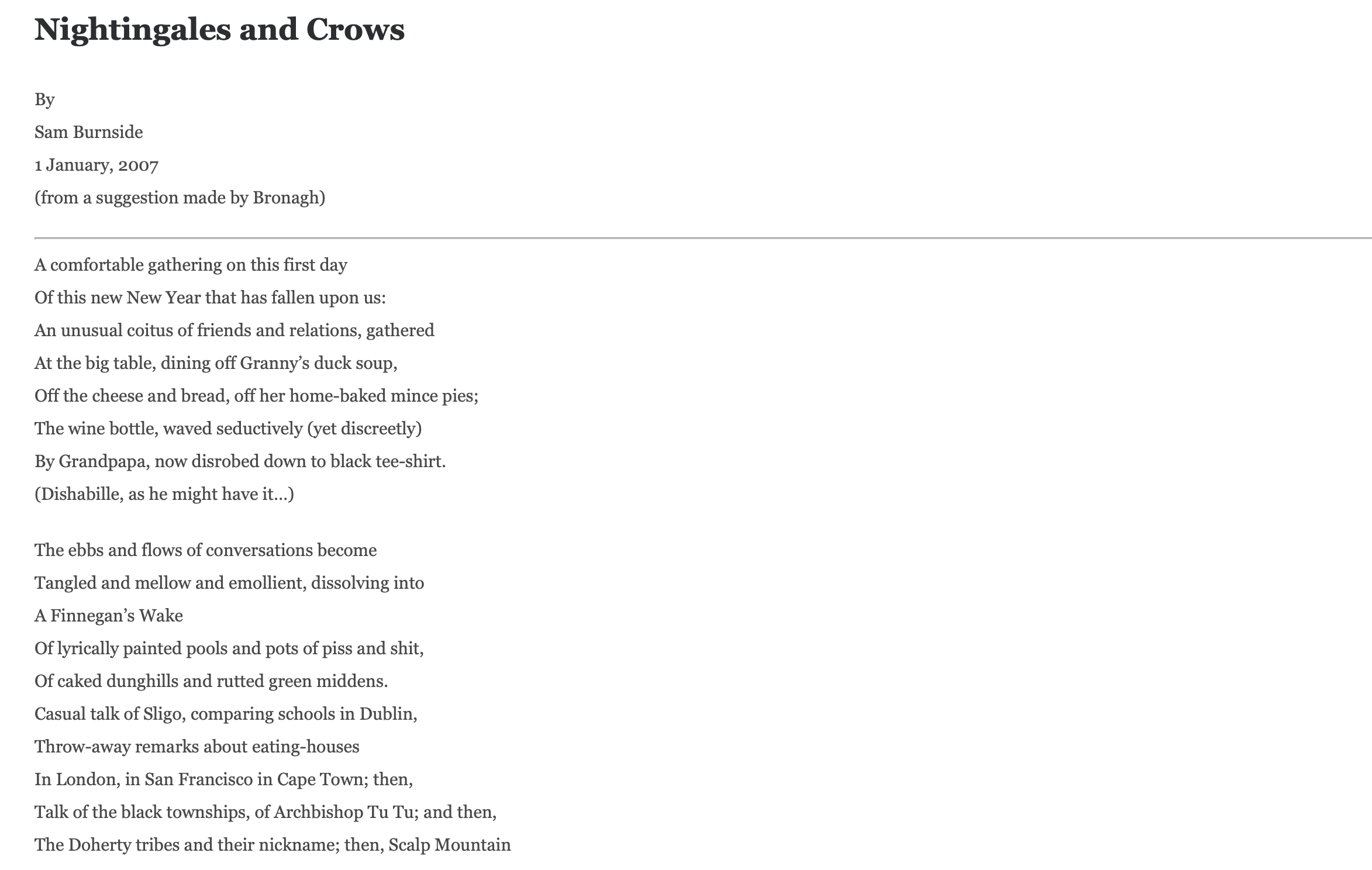 LauraAdmin2021-06-14T21:54:40+00:00'Nightingales and Crows' By Sam Burnside 1 January, 2007 (from a suggestion made by Bronagh) A comfortable gathering on this first day Of this new New Year that has fallen upon us: An unusual coitus of friends and relations, gathered At the big table, dining off Granny’s duck soup, Off the cheese and bread, off her
