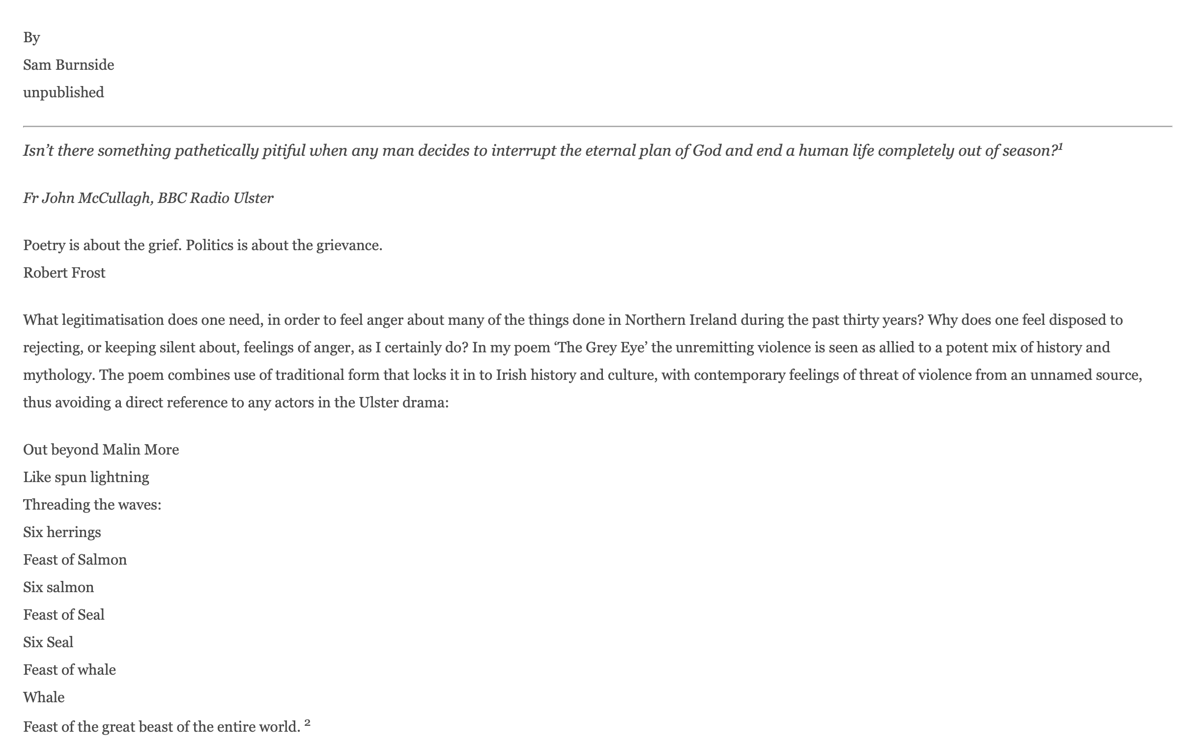 LauraAdmin2021-06-29T10:16:34+00:00'The Poetry and Processing of Anger' By Sam Burnside unpublished Isn’t there something pathetically pitiful when any man decides to interrupt the eternal plan of God and end a human life completely out of season?1 Fr John McCullagh, BBC Radio Ulster Poetry is about the grief. Politics is about the grievance. Robert Frost What legitimatisation does