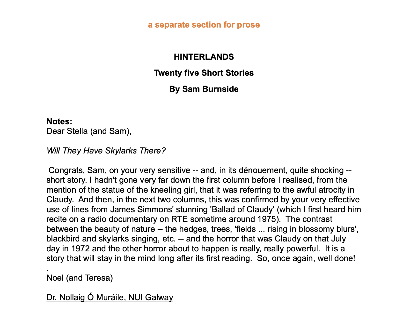 LauraAdmin2021-06-15T10:32:18+00:00'Hinterlands' Twenty five Short Stories Poems By Sam Burnside Four of these stories first appeared in the Derry Journal during the month of August 2018, illustrated by Joe Campbell The others were provided to the inaugural Literature Festival at Culmore. This is to mark and celebrate the creation and opening of a community hub in the newly