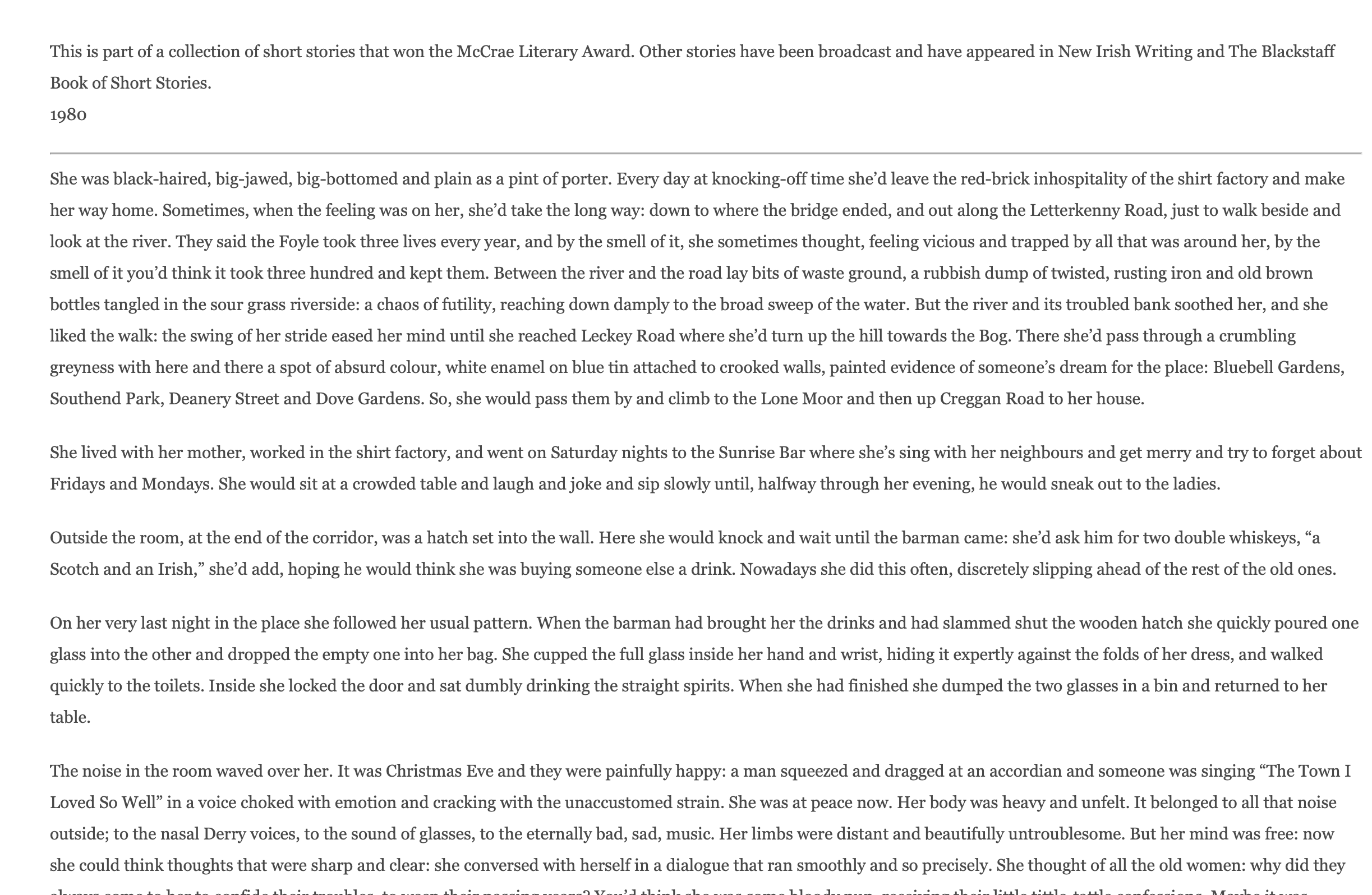 LauraAdmin2021-06-15T11:26:16+00:00'Christmas at the Sunrise Bar' This is part of a collection of short stories that won the McCrae Literary Award. Other stories have been broadcast and have appeared in New Irish Writing and The Blackstaff Book of Short Stories. 1980 She was black-haired, big-jawed, big-bottomed and plain as a pint of porter. Every day