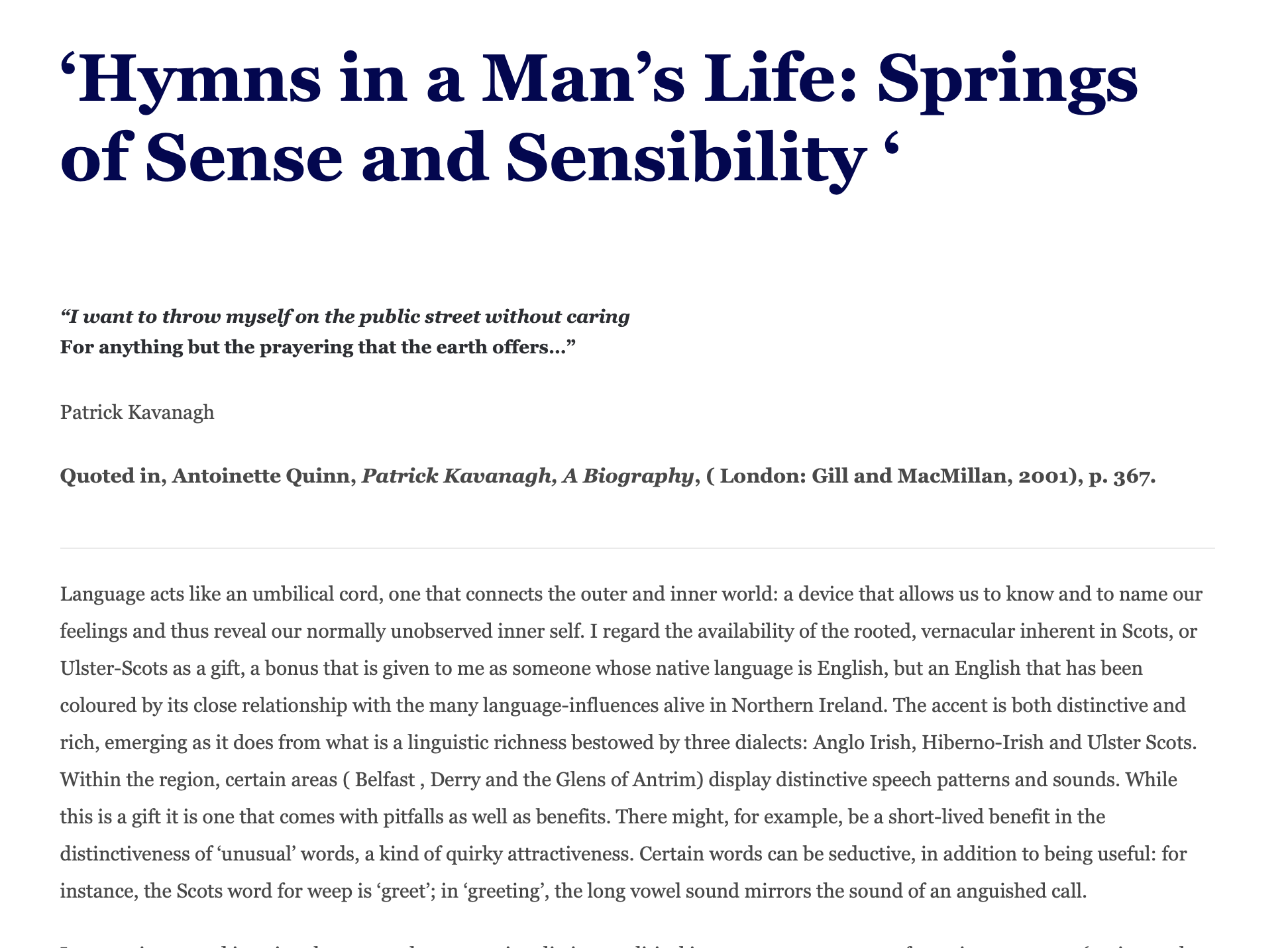 LauraAdmin2021-06-29T10:10:18+00:00'Hymns in a Man's Life: Springs of Sense and Sensibility ' “I want to throw myself on the public street without caring For anything but the prayering that the earth offers…” Patrick Kavanagh Quoted in, Antoinette Quinn, Patrick Kavanagh, A Biography, ( London: Gill and MacMillan, 2001), p. 367. Language acts like an umbilical cord,