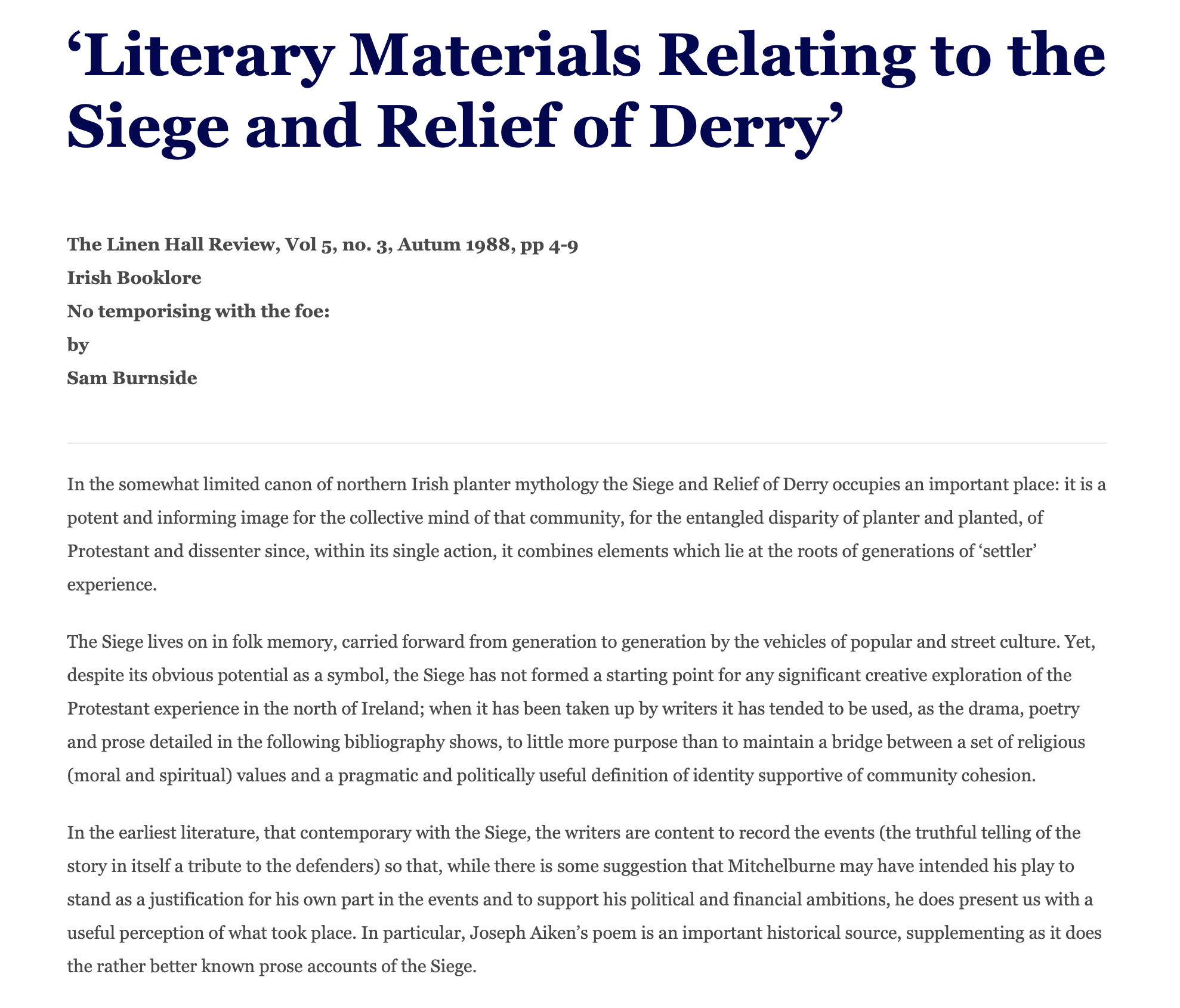 LauraAdmin2021-06-29T10:10:53+00:00'Literary Materials Relating to the Siege and Relief of Derry' The Linen Hall Review, Vol 5, no. 3, Autum 1988, pp 4-9 Irish Booklore No temporising with the foe: by Sam Burnside In the somewhat limited canon of northern Irish planter mythology the Siege and Relief of Derry occupies an important place: it is