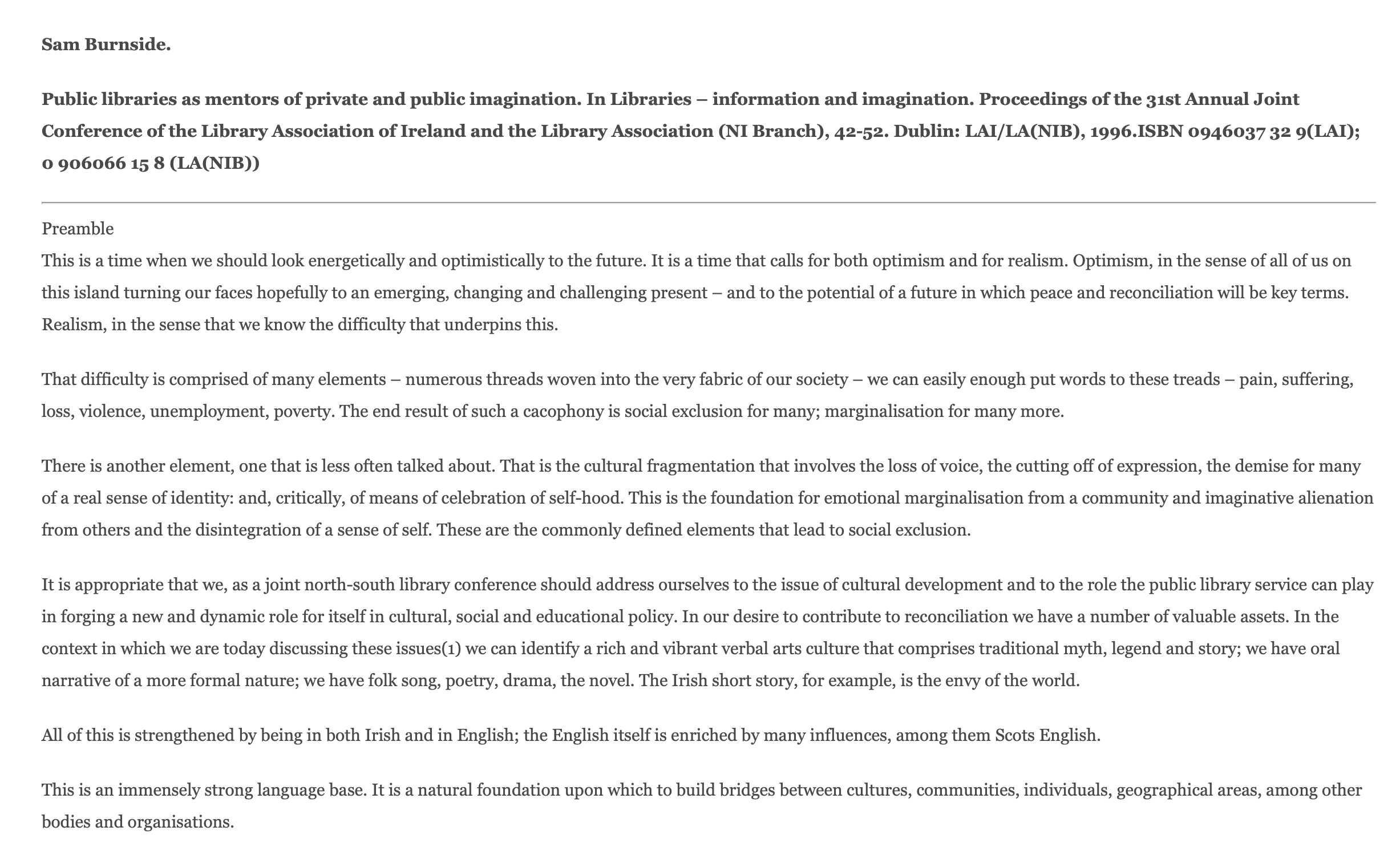 LauraAdmin2021-06-14T21:38:05+00:00'Public Libraries as Mentors of Private and Public Imagination' By Sam Burnside Public libraries as mentors of private and public imagination. In Libraries – information and imagination. Proceedings of the 31st Annual Joint Conference of the Library Association of Ireland and the Library Association (NI Branch), 42-52. Dublin: LAI/LA(NIB), 1996.ISBN 0946037 32 9(LAI); 0 906066 15 8