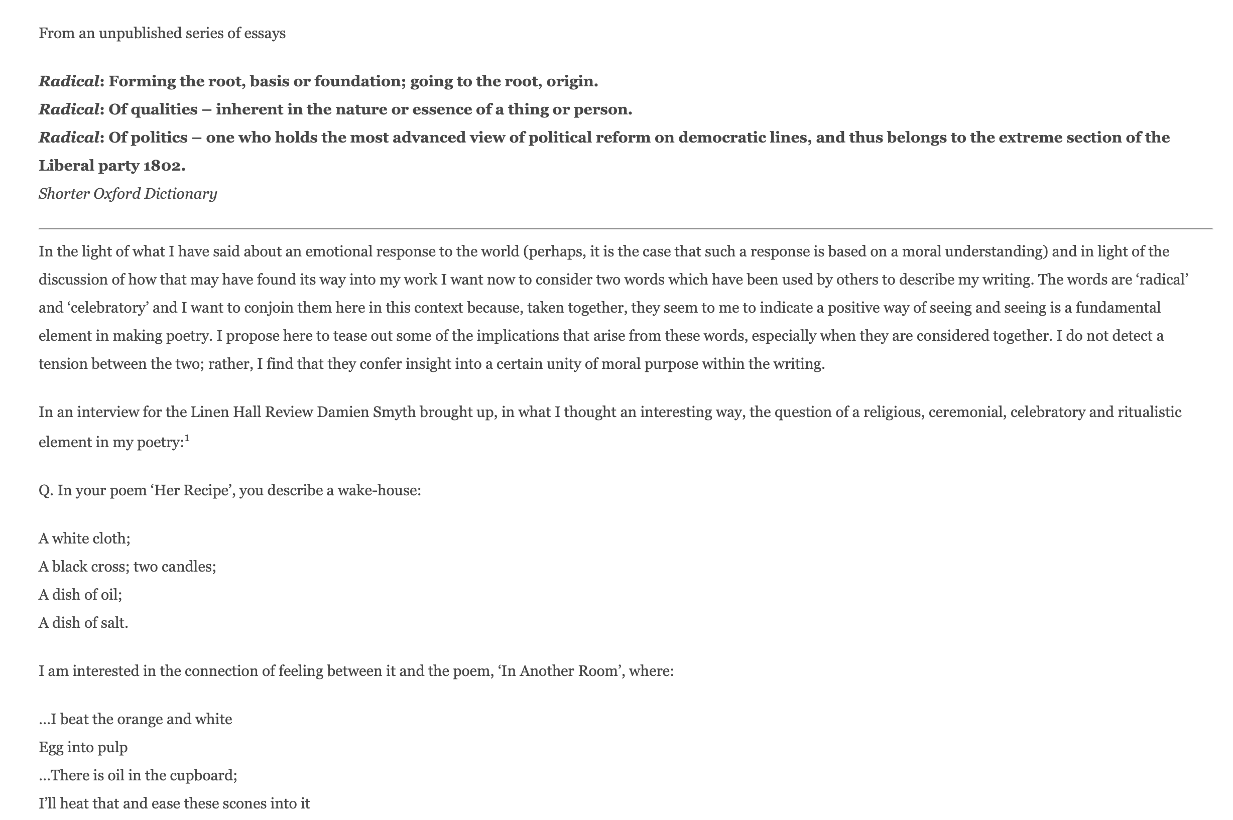 LauraAdmin2021-07-28T13:31:35+00:00'The Radical and the Celebratory' ‘Defining the Inheritance’, Sam Burnside interviewed by Damien Smyth, Linenhall Review, Volume 6, Number 3, Winter 1989, pp. 5-9 Radical: Forming the root, basis or foundation; going to the root, origin. Radical: Of qualities – inherent in the nature or essence of a thing or person. Radical: Of politics – one who holds the