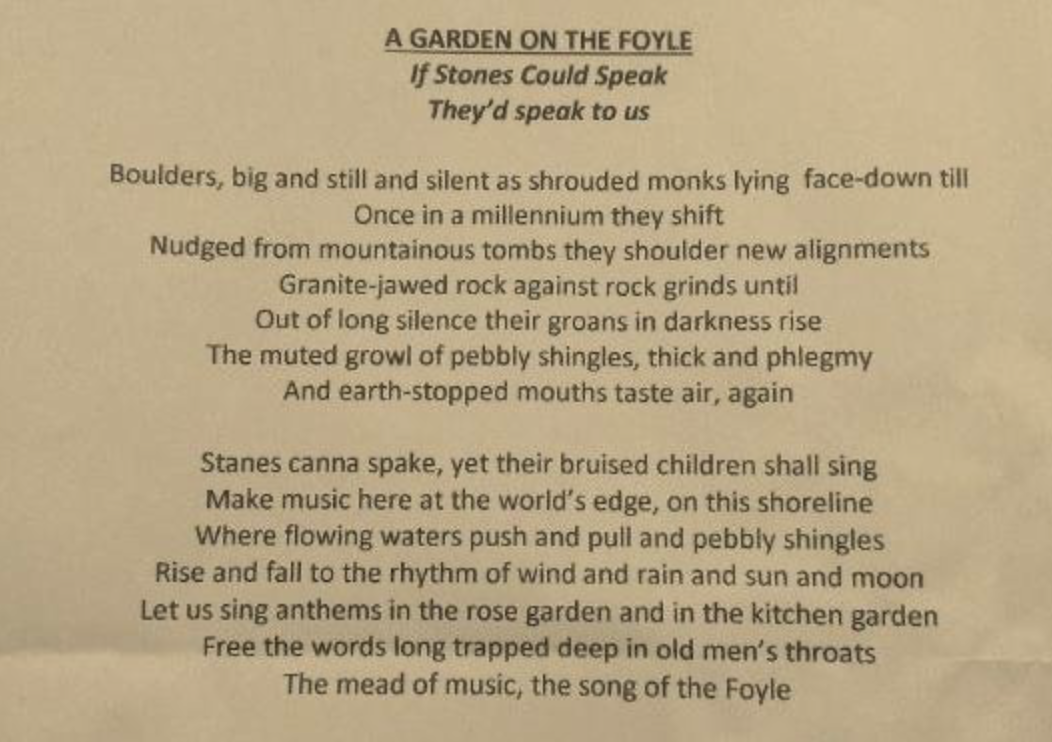 LauraAdmin2021-06-08T14:18:06+00:00'A Garden on the Foyle' "Acclaimed Derry-based poet Sam Burnside has taken inspiration from the monumental proposals to develop a massive £67m river garden around the Boom Hall and Brook Hall estates." www.derryjournal.com Listen