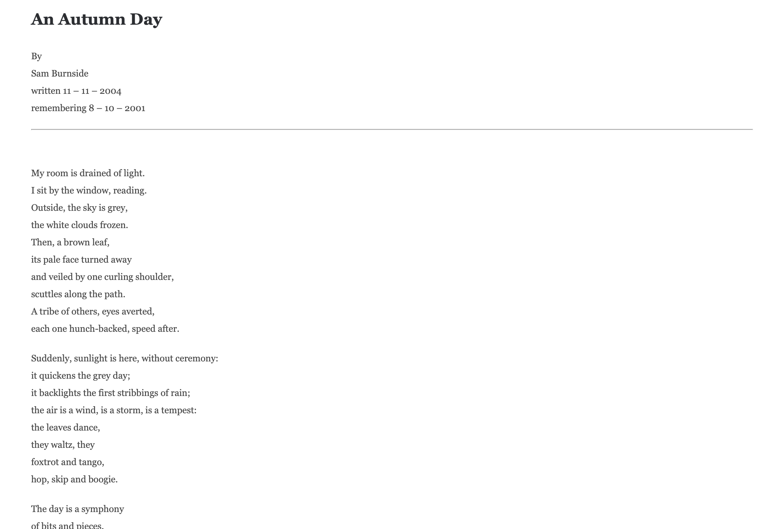 LauraAdmin2021-06-14T22:24:56+00:00'An Autumn Day' This was recently read as for the BBC radio Foyle World Day 2014. Read by Sam Burnside. By Sam Burnside written 11 – 11 – 2004 remembering 8 – 10 – 2001 My room is drained of light. I sit by the window, reading. Outside, the sky is grey,