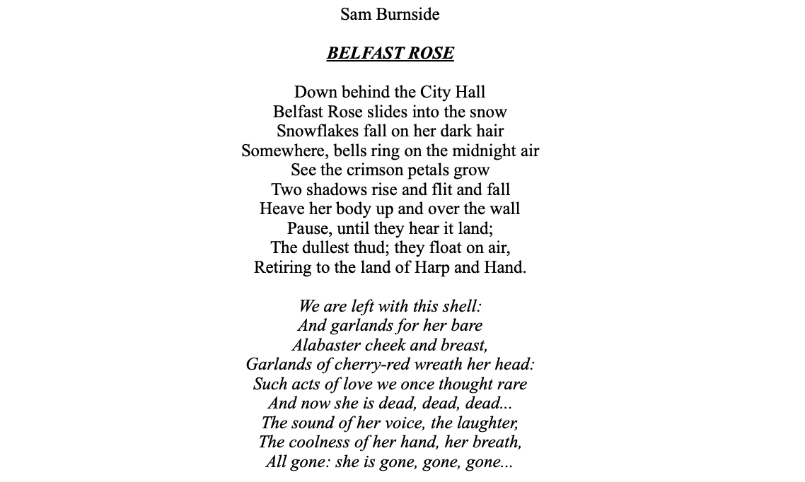 LauraAdmin2021-06-15T10:50:29+00:00'Stretcher Bearer' Stretcher Bearer (an extract) appeared on BBC Radio Foyle, October 2014. Stretcher Bearer appeared in a The Narrow Fellow, Journal of Poetry, spring, USA. 2015 ‘Stretcher Bearer’s Story’is collected in Forms of Freedom. Poems, by Sam Burnside, Lapwing Poetry, Belfast, 2015. (Stretcher Bearer was nominated for the prestigious Pushcart Prize, USA, 2016) ________________________________ Moths have
